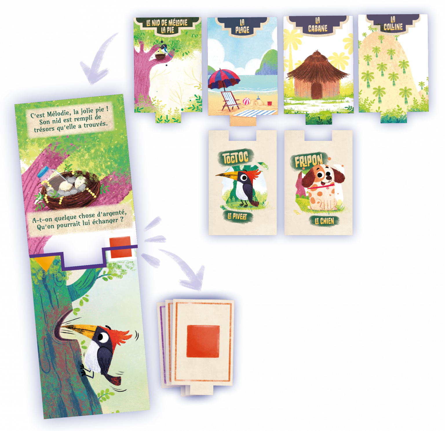 Autre jeu narratif, autre ambiance. Pourtant le concept mécanique reste le même : créer des symboles en assemblant des cartes pour en piocher de nouvelles et faire avancer l’aventure. Mais là où « Unlock Kids » propose des « promenades » remplies d’énigmes, « Le Miniz Club » se concentre sur la narration. De plus, là où « Unlock Kids » est conçu pour que les Marmots puissent jouer tout seuls, « Le Miniz Club » prend son sens autour du duo parent/enfant. Le parent est là pour lire les textes, créer l’ambiance et aiguiller parfois l’enfant qui devra, lui, prendre les bonnes décisions.