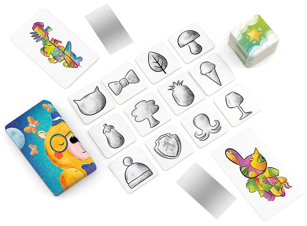 Chaque joueur possède un petit miroir. Le but : dans de grandes images faites de formes entremêlées, vous devez repérer le plus rapidement des moitiés d’objets ou d’animaux qui y sont cachées. Utilisez votre miroir pour les reconstituer en entier.
