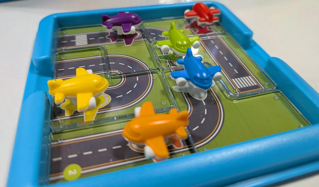 La première nous a énormément fait penser à « Pôle position », un puzzle-game de leur gamme de voyage magnétique. Elle reprend le principe des polyominos transparents sur lesquels sont fixés des petits véhicules. Mais, ici, les voitures de course ont laissé la place à des avions de ligne. Et alors que les voitures avaient pour particularité de pouvoir pivoter à 180° pour multiplier les possibilités de pose, ici, les avions sont fixes. D’où son accessibilité dès 5 ans.