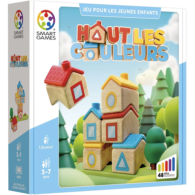 À destination des tout petits à partir de 3 ans, « Haut les couleurs » reprend le concept des cubes à empiler. Mais les cubes sont ici des petites maisons aux toitures colorées, coiffées de cheminées et aux fenêtres de différentes formes (carré, rond ou triangle).