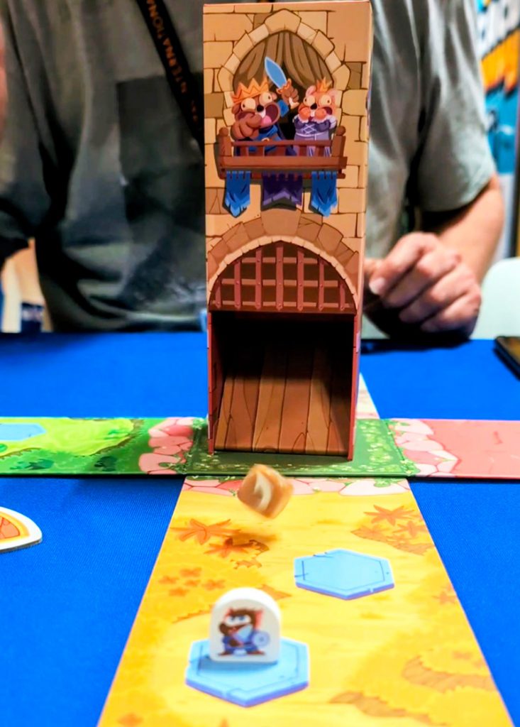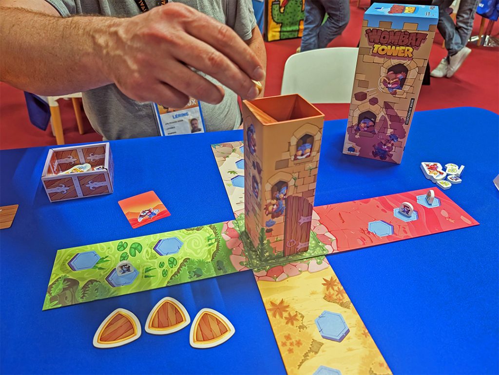 Un tower défense qui utilise toutes les manières de balancer des dés sur des figurines : voilà une idée saugrenue et complètement régressive pour les parents. Même si notre seule partie a été un peu brouillonne à cause de règles pas très bien expliquées, j’ai vraiment hâte de le faire découvrir à mon Marmot de 9 ans. Mais il va nous falloir un peu de patience puisque « Wombat Tower » ne sort qu’en septembre.