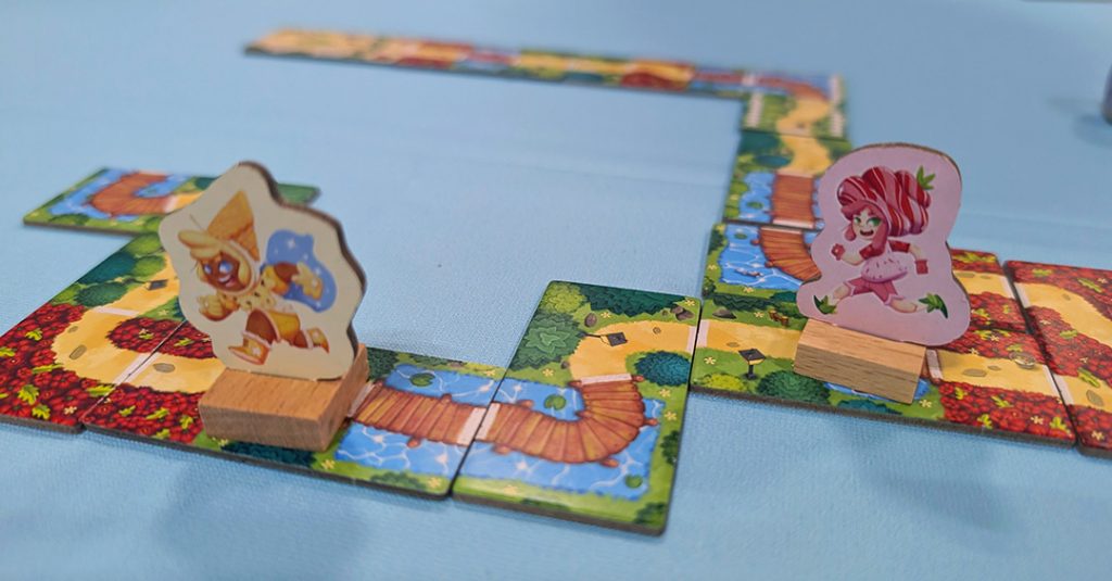 Devant vous, 2 dominos représentant chacun un duo de paysages. À votre tour, vous posez l’un d’eux pour agrandir le parcours en faisant en sorte que les paysages connectés soient identiques. Le second paysage du domino indique alors jusqu’où votre figurine peut avancer. S’il s’agit d’un lac, par exemple, vous la déplacez jusqu’au premier lac libre disponible sur son chemin. Si aucune tuile ne vous convient, vous pouvez passer votre tour pour en piocher 2 supplémentaires.