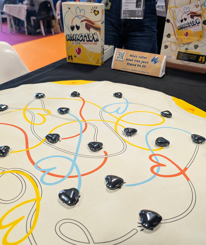 Pendant notre partie de Bomb5, un bruit familier se faisait entendre sur la table derrière nous. Le bruit que font les aimants de Kluster lorsqu’ils s’entrechoquent. Intrigués, on a donc jeté un œil. Et effectivement, au premier abord, « Attraction » (puisqu’il s’agit de son nom) avait tout l’air d’un clone de Kluster. Pourtant, après une rapide recherche, il se trouve que ce jeu lui est antérieur de 7 ans, la première édition américaine datant de 2012.