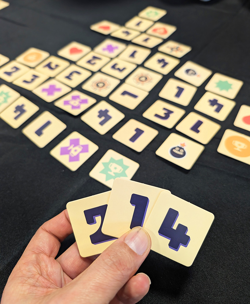 Vous avez en main 3 tuiles Chiffres pouvant aller de 1 à 4. À chaque tour, vous en placez une sur la grille centrale et essayez d’atteindre la somme de 5 sur une rangée de tuiles adjacentes. Si vous réussissez, vous pouvez placer l’une de vos tuiles Coupes à l’extrémité libre de cette rangée. Vous retournez alors la tuile qui se trouve à l’autre extrémité. S’il s’agit d’une tuile Coupe d’un adversaire, elle est retournée sur sa face vide. C’est un point de moins pour lui. S’il s’agit d’une bombe, elle explose selon l’effet qui est indiqué sur son verso. Ces explosions créent des réactions en chaîne qui peuvent impacter d’autres tuiles bombes et d’autres tuiles Coupes de la grille.
