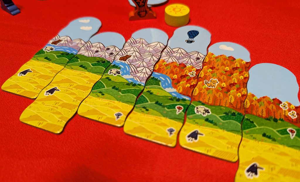 C’est d’ailleurs en montgolfière que va se dérouler votre voyage sous la forme d’une petite figurine qui va tourner autour d’un cercle de tuiles. Comme dans Tokaïdo ou dans de nombreux jeux de Uwe Rosenberg, c’est toujours le joueur en dernière position qui joue. Il choisit une tuile en tournant dans le sens des aiguilles d’une montre et la place à droite ou à gauche de son panorama.