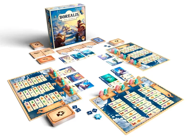 Des règles très simple qui paraissent agréables à expliquer et à assimiler. Pour autant, Borealis semble nous offrir une stratégie de jeu en parfait équilibre simplicité/intérêt. Et puis, on a hâte car Borealis a ce qu’on aime le plus dans les jeux ; un scoring sur plusieurs axes. En effet, on va marquer des points par carte validée mais aussi suivant des objectifs communs piochés en début de partie, également en avançant sur la piste de score des moyens de transport, mais aussi en collectant des jetons de victoire au cours de la partie. Et tous ces objectifs communs changent à chaque nouvelle partie, pas le temps de se lasser !