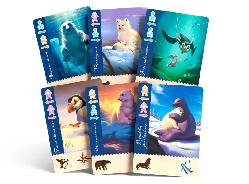 A notre tour de jeu, il va falloir prendre une photo en choisissant, bien sûr, parfaitement l’animal à immortaliser. En effet, un animal « coûte » la présence de scientifiques déterminés sur sa zone mais va aussi nous faire déplacer nos scientifiques sur un autre emplacement. Il va donc falloir anticiper drôlement ses actions pour se retrouver avec les bons scientifiques à la bonne place pour les tours d’après. Une fois l’animal pris en photo on vérifie si on a bien utilisé le moyen de transport demandé pour avancer sur sa piste de score. Car oui, Borealis est un jeu à points de victoire, que l’on va accumuler de plein de façons différentes.
