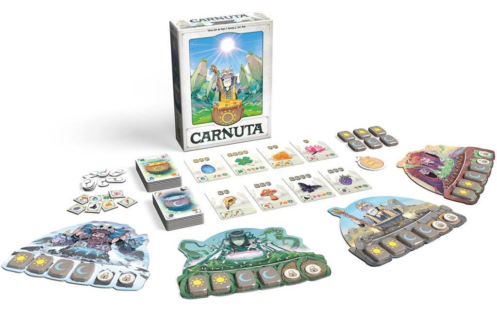 Dans Carnuta, nous participons à un concours de druides et devons concocter la meilleure potion de 11 ingrédients/cartes. Ces ingrédients nous allons les collecter grâce à nos runes (des vraies runes, oui oui !) si ces dernières correspondent bien au coût demandé. Mais une fois la carte intégrant notre potion il va falloir défausser et/ou flipper certaines de nos runes.