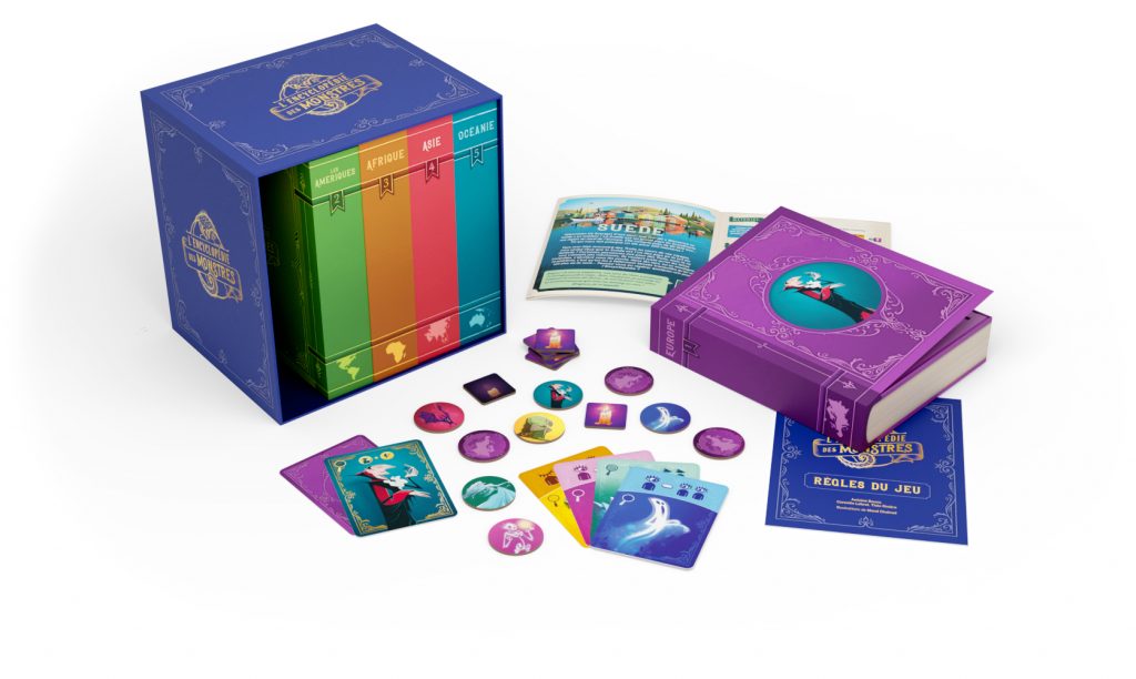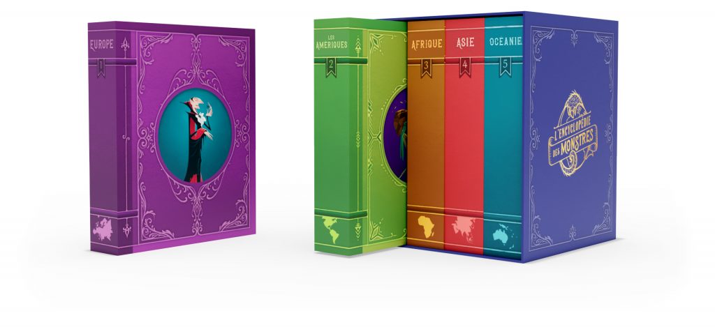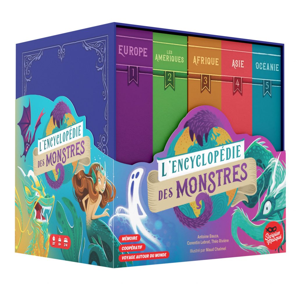 Un an après la petite boîte de « L’île des Mookies », Scorpion Masqué revient au jeu Marmot avec cet énôôôrme et très intrigant coffret. Rassurez-vous, le titre a beau indiquer une encyclopédie, Scorpion Masqué ne s’est pas lancé dans l’édition de livres éducatifs. Il s’agit d’un jeu évolutif qui vous invite à chasser des monstres dans 15 pays répartis sur les 5 continents (d’où les 5 tomes du coffret).