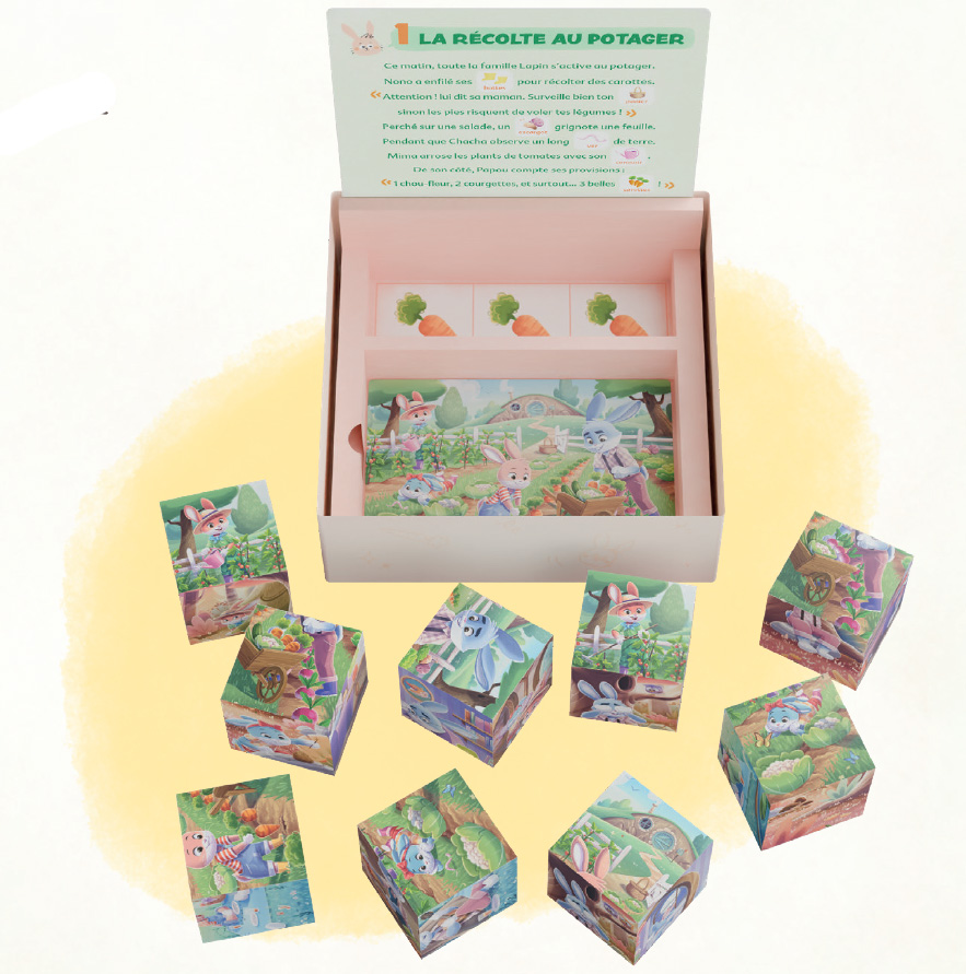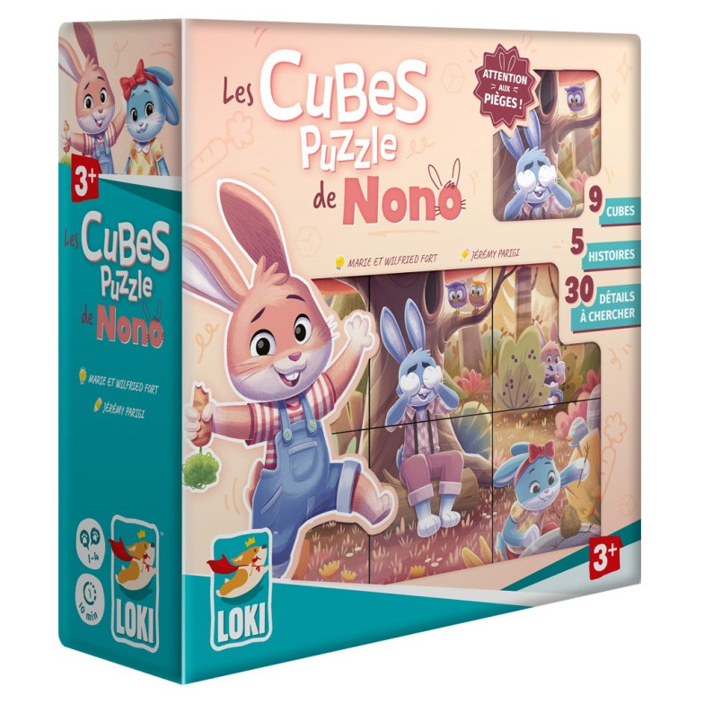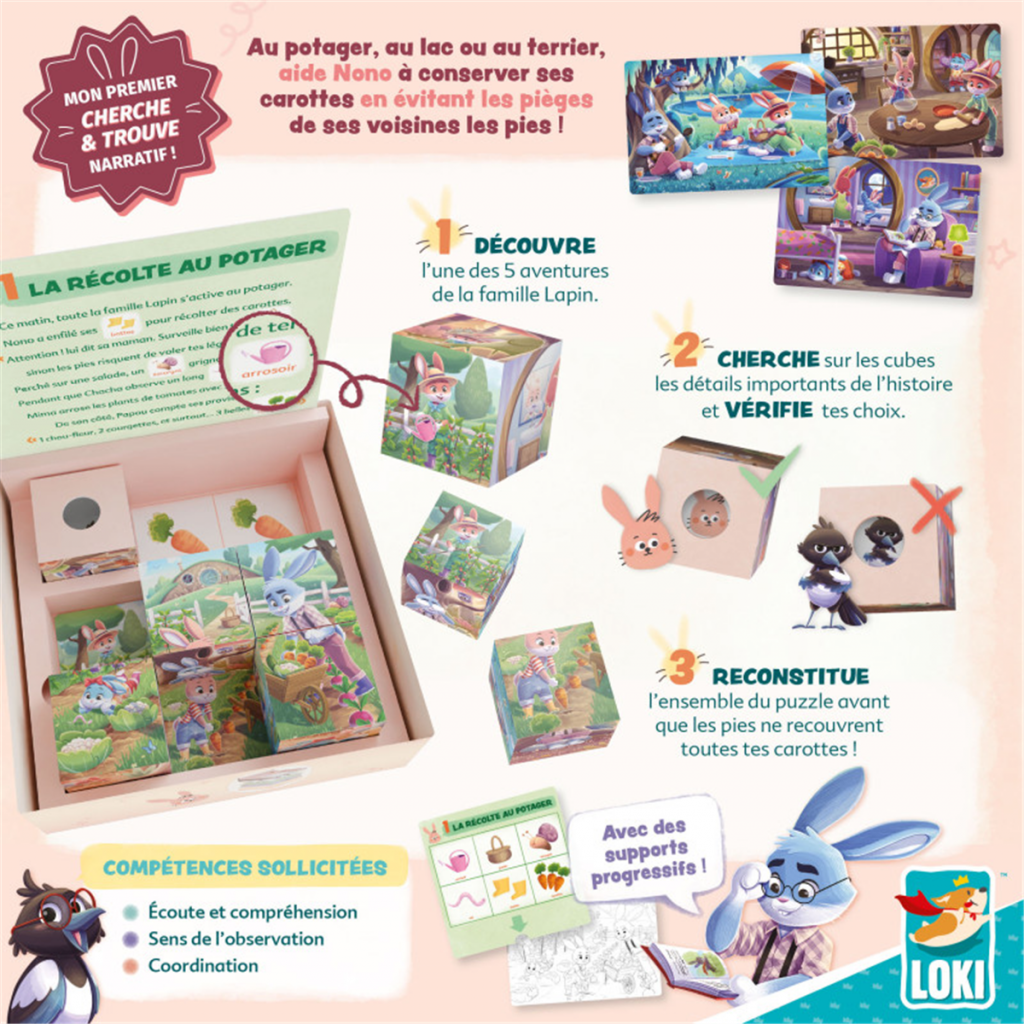 Au fil de 5 histoires différentes, les Marmots vont devoir retrouver des éléments clés parmi 9 cubes. Mais attention, 3 de ces cubes sont des leurres. Une petite ouverture sur l’une de leurs faces permet de regarder à l’intérieur de chacun d’eux. S’ils aperçoivent Nono le lapin, ils ont fait le bon choix. Si c’est une pie, ils ont commis une erreur. Leur but : trouver les 6 bons cubes et reconstituer le puzzle avant de révéler la 3ème pie.