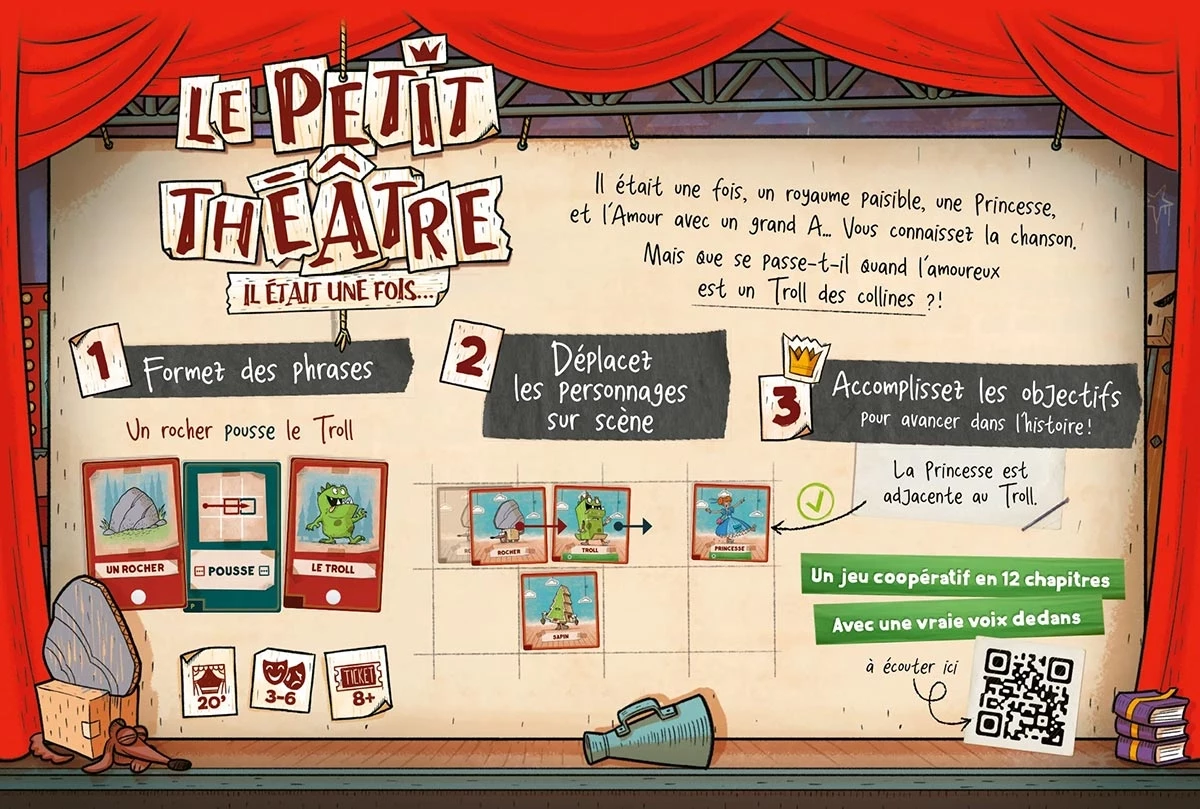 Et mécaniquement, le jeu est aussi audacieux que la forme. Il s’agit d’un puzzle game coopératif où les joueurs vont créer des phrases à partir des personnages et des cartes verbes qu’ils ont en main. Chaque phrase génère une action qui permet de déplacer les « acteurs » sur une grille et de résoudre le but de chaque acte.