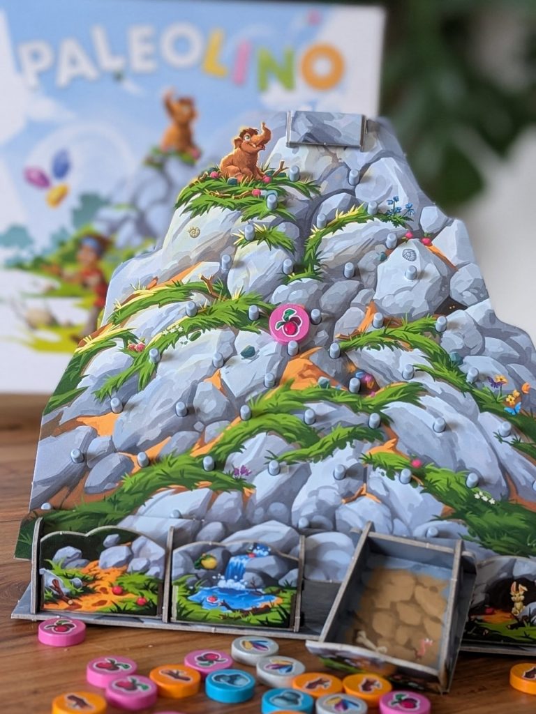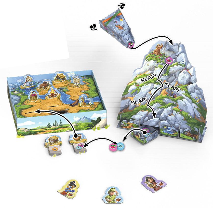 Regardez là-haut sur la montagne ! Lino le gentil mammouth, a trouvé du bois, des pierres, des baies et même de jolis cristaux. Secouez ces jetons du haut de la montagne et regardez-les dévaler la pente jusqu’aux cavernes, dans un joyeux tumulte.