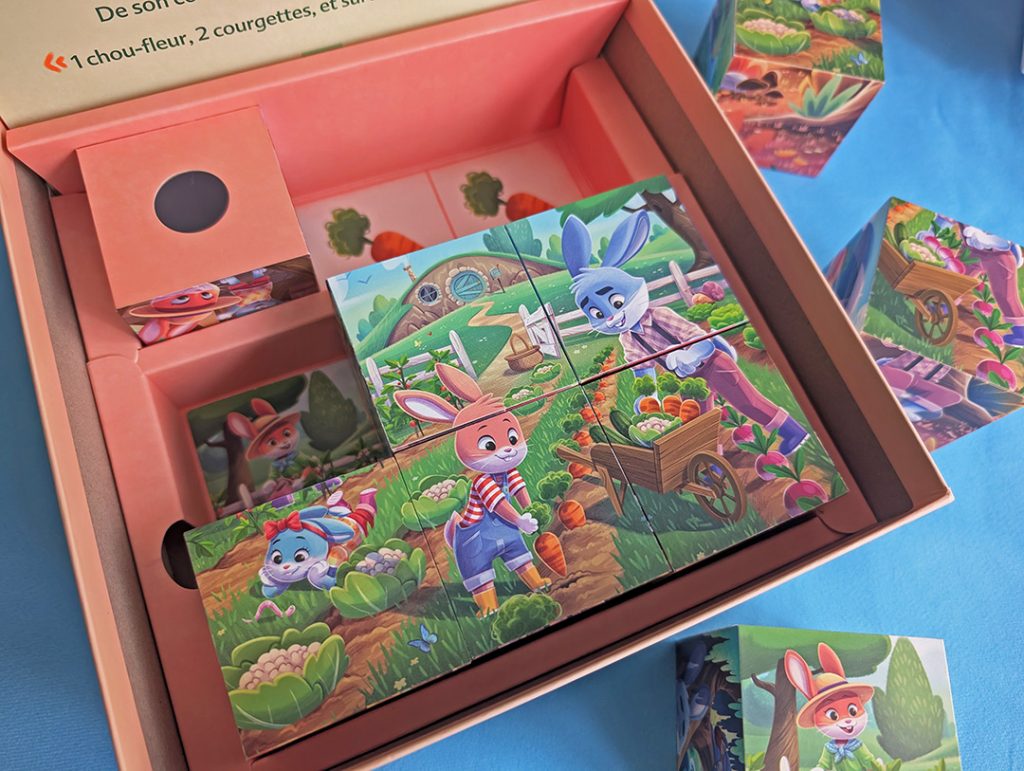 Derrière ces cubes, se cache un puzzle narratif. Votre Marmot va devoir retrouver les éléments clés de chacune des 5 histoires, parmi 9 cubes. Mais attention : 3 de ces cubes sont des leurres. Pour vérifier s’il ne s’est pas trompé, rien de plus simple. Il suffit de jeter un œil à travers la petite ouverture qui se trouve sur l’une des faces de chaque cube. Si votre Marmot aperçoit Nono le lapin, il a fait le bon choix. Si c’est une pie, il a commis une erreur.