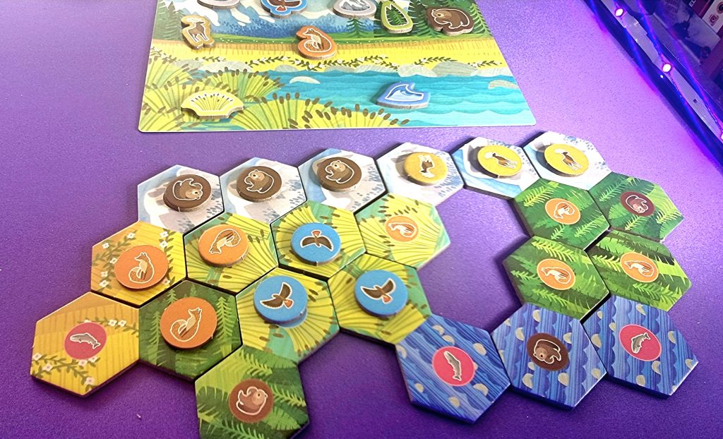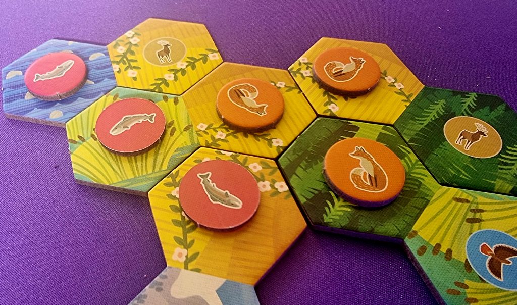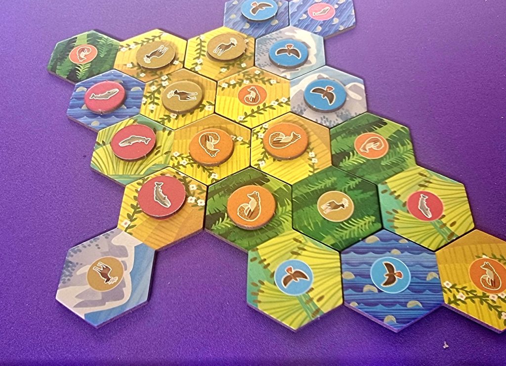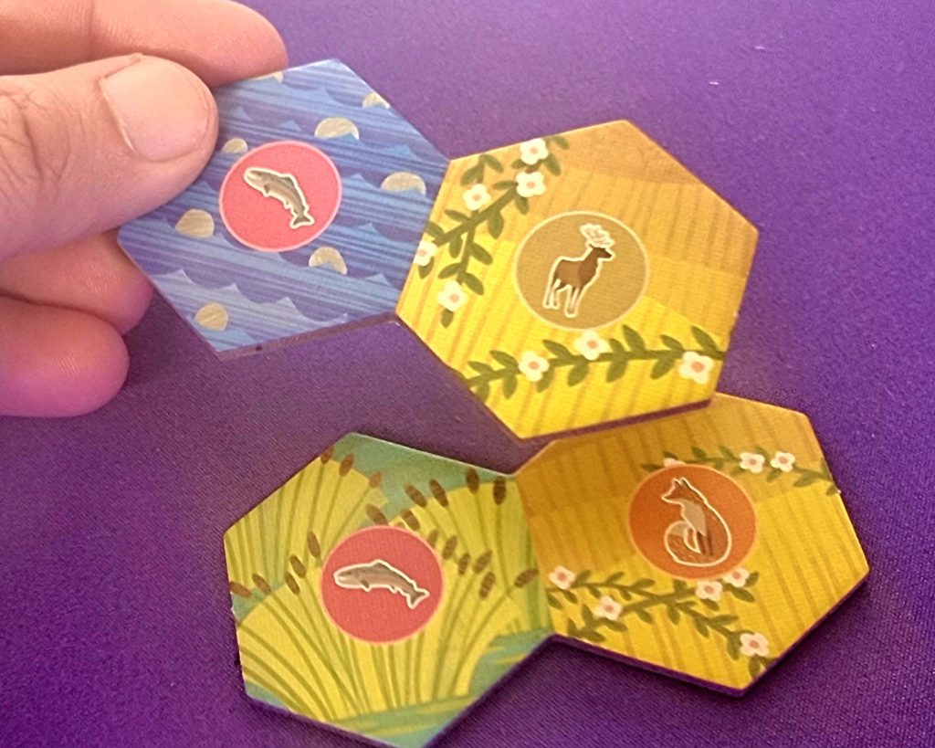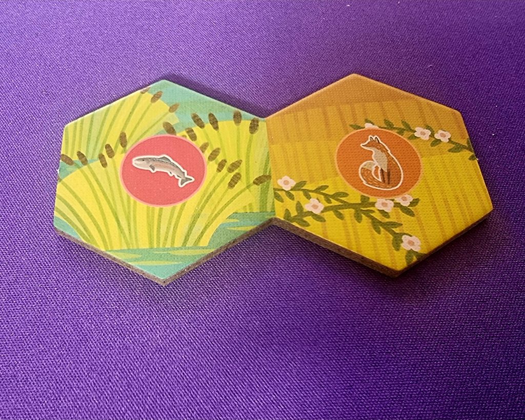 Les tuiles hexagonales constituent quant à elles le cœur du jeu. Chacune est composée de deux hexagones et représente une combinaison d’animal et d’habitat : saumon et prairie, buse et montagne, par exemple. C’est en regroupant judicieusement ces tuiles que les joueurs gagnent, en cours de partie, des animaux à placer sur leur panorama, puis des jetons d’habitat lors du décompte final.