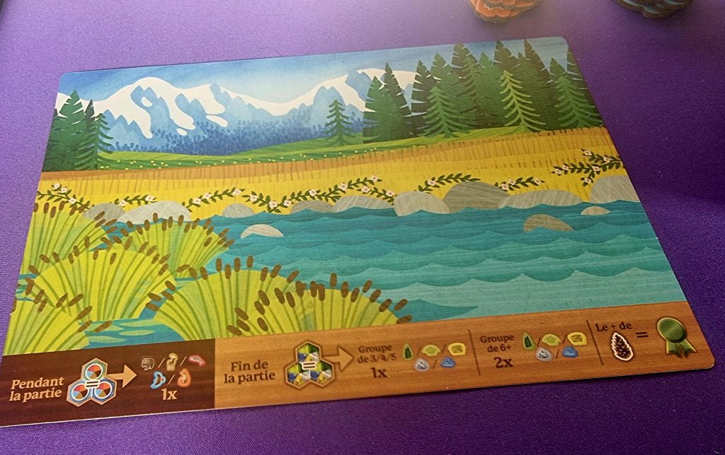 Les combos d’animaux ne sont toutefois pas la seule manière de marquer des points. En fin de partie, vous procéderez également au décompte des habitats similaires connectés. Pour chaque groupe adjacent de 3, 4 ou 5 tuiles d’un même habitat (forêt, prairie, lac, montagne…), vous gagnez un jeton correspondant à placer sur votre panorama. Au-delà de 5 tuiles connectées, vous en récupérez deux. Ces jetons habitat comportent eux aussi des pommes de pin au verso, et contribuent donc directement au score final.