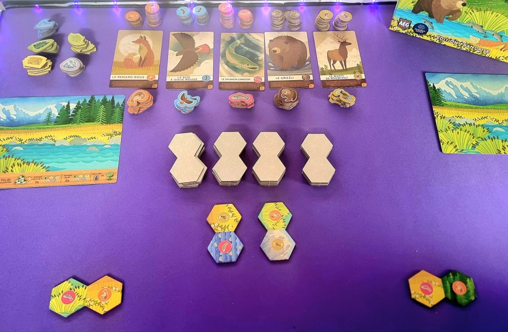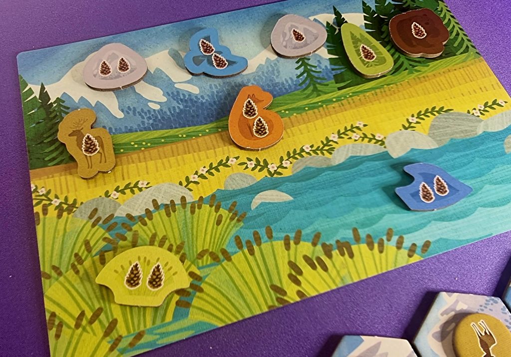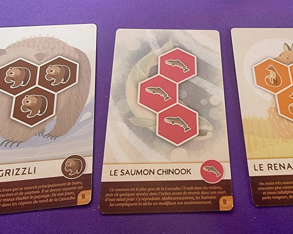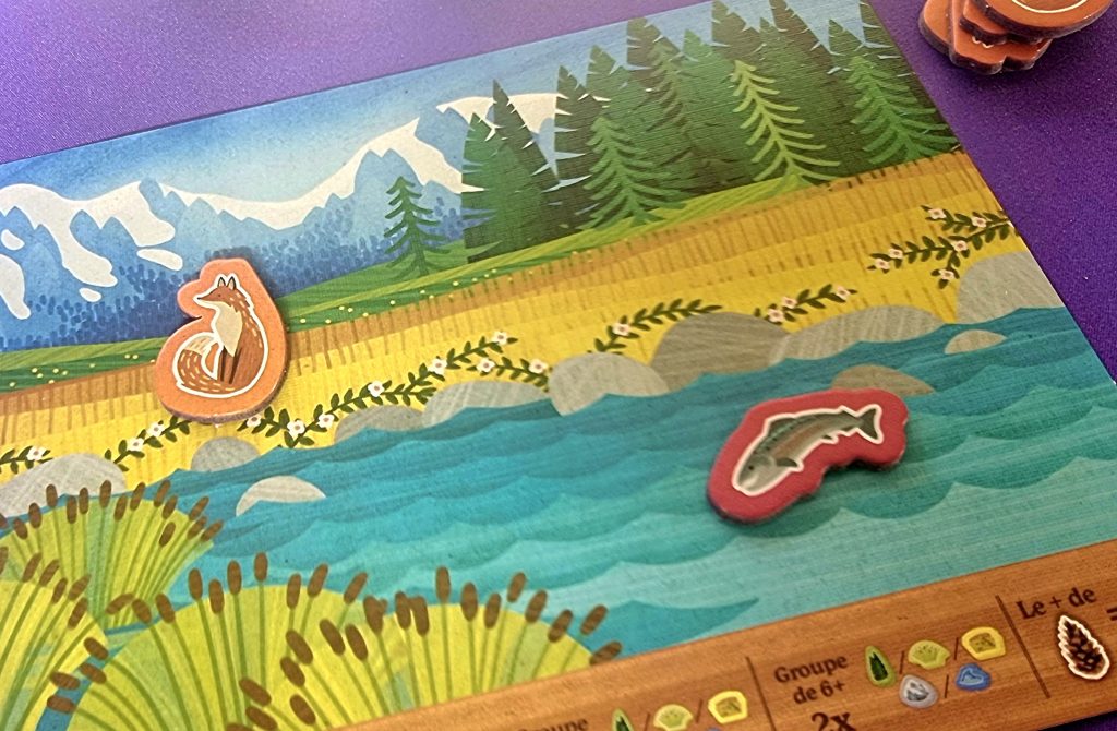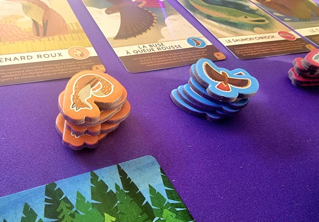 Pour entrer un peu plus dans les détails, précisons que les jetons animaux (ours, wapiti, renard, buse ou saumon) sont tous associés à des cartes animaux correspondantes. Les jetons servent à matérialiser les animaux gagnés au cours de la partie, tandis que certains pions permettent de se souvenir des zones déjà scorées.