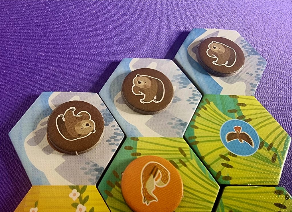 Concrètement — et parce que la phrase précédente ne voulait assurément pas dire grand-chose — on peut résumer ainsi : aligner trois tuiles comportant un ours permet de récupérer un jeton ours, que l’on place sur sa feuille de panorama. Ce panorama sera ensuite complété, en fin de partie, par des jetons « habitat » (montagne, lac, prairie, etc.) qui serviront à établir le scoring final.