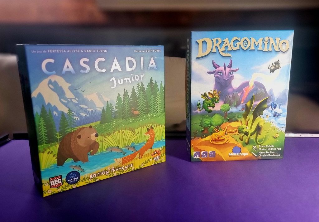 Cascadia Junior est clairement plus “mature”, avec ses tuiles hexagonales offrant davantage de possibilités stratégiques, et ce fameux panorama à compléter qui permet de visualiser son score. Dragomino, de son côté, s’adresse à des enfants encore plus jeunes (dès 5 ans).