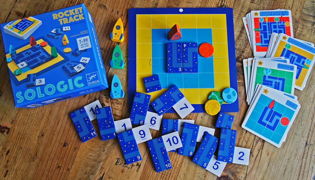Rocket Track et extrêmement plaisant à manipuler. L’imbrication des polyominos à double couche vient renouveler un concept très classique en y ajoutant une réflexion sur le relief. Le thème nous laisse par contre perplexes. Pourquoi avoir choisi des fusées et des planètes ? De simples petites voitures roulant vers des maisons de même couleur auraient été plus logiques et auraient permis un petit jeu de manipulation très concret pour conclure chaque défi.
