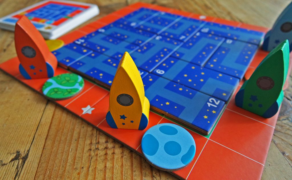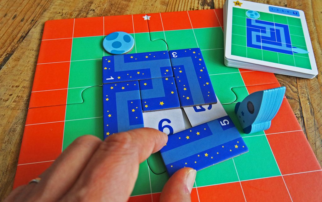 Alors que la mission Artémis II vient de rentrer sur terre après avoir fait le tour de la Lune, Djeco vous propose d’aller encore plus loin dans l’espace. Pas besoin de formation d’astronaute ni de tests poussés, il vous suffira d’imbriquer des polyominos double-couche en forme de L pour envoyer vos fusées à bonne destination. Pour chaque défi, utilisez les polyominos demandés par la carte du défi en cours et imbriquez-les pour reconstituer le labyrinthe qui permet à chaque fusée de rejoindre la planète à sa couleur. Il faut pour cela recouvrir les chiffres indiqués sur les couches inférieures, par les couches supérieures où se trouvent les morceaux de labyrinthe.