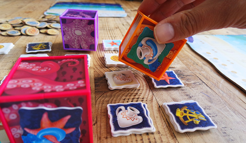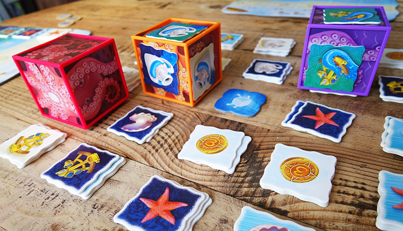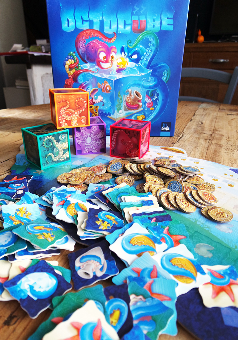 Dans le fond (marin), « Octocube » est un jeu de collection très classique où l’on doit récupérer des séries de tuiles Objets et assurer des majorités.