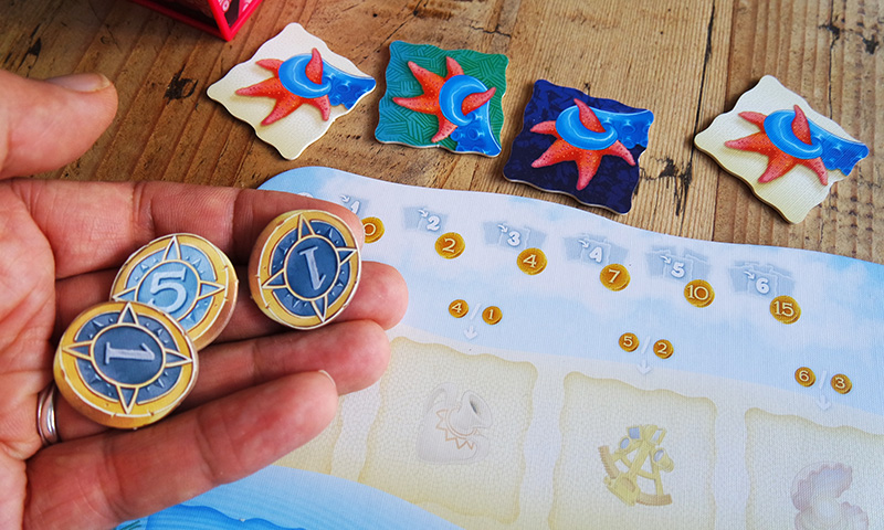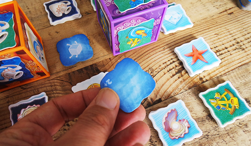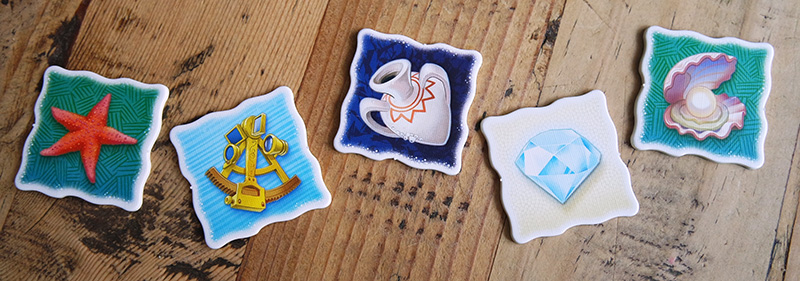 Les objets sont de 5 types (étoiles de mer, amphore, sextant, perle ou diamant), et peuvent avoir un arrière-plan de 4 couleurs différentes. L’ensemble des combinaisons possibles est d’ailleurs représenté sur votre plateau personnel, chaque colonne représentant un type d’objet et chaque ligne une couleur.