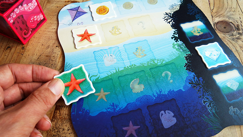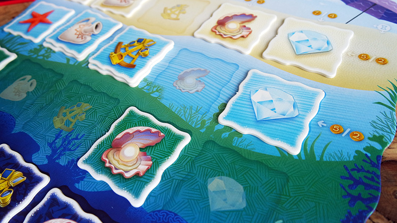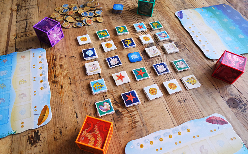 Avant de débuter la partie, des piles de tuiles Objets sont placées en une grille de 5 par 5 (4 par 4 à 2 joueurs) pour former un fond marin.